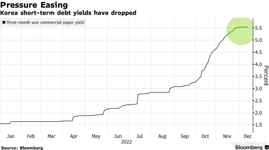 最近几个月,在江原道一家游乐园的开发商9月底发生债务违约后,韩国商业票据收益率飙升至2009年初以来的最高水平。这促使韩国官员推出了包括至少50万亿韩元援助计划在内的措施来缓解压力。