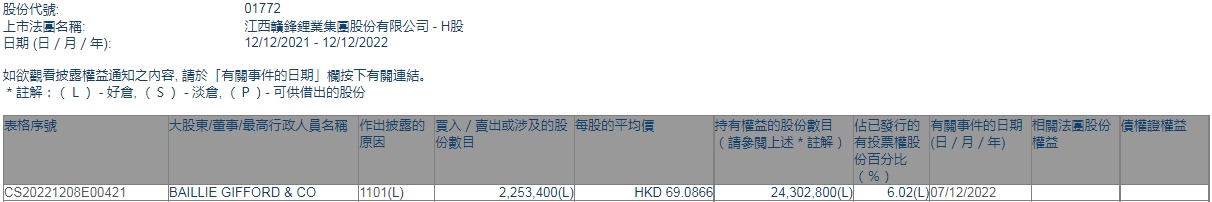 智通财经APP获悉,香港联交所最新资料显示,12月7日,BAILLIE GIFFORD & CO增持赣锋锂业(01772)225.34万股,每股作价69.0866港元,总金额约为1.56亿港元。增持后最新持股数目为2430.28万股,最新持股比例为6.02%。