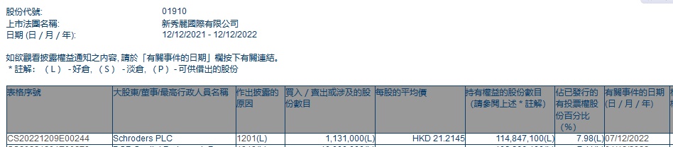 智通财经APP获悉,香港联交所最新资料显示,12月7日,Schroders Plc减持新秀丽(01910)113.1万股,每股作价21.2145港元,总金额约为2399.36万港元。减持后最新持股数目约为1.15亿股,最新持股比例为7.98%。