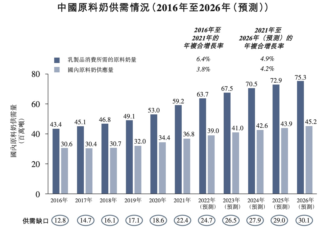 弗若斯特沙利文报告显示,我国原料奶市场多年来供给不足,供应缺口预计到2026年将达到约3010万吨,这也将进一步推动优质原料奶需求的增长。