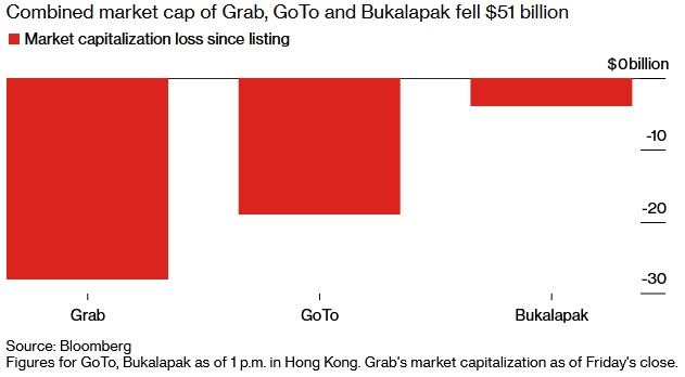 智通财经APP获悉,印尼最大科技公司GoTo、印尼电商平台Bukalapak和新加坡网约车巨头Grab(GRAB.US)这三家东南亚独角兽自上市以来,在过去一年半时间里市值总计缩水510亿美元。数据显示,这三家公司自上市以来均下跌超过65%,表现均逊于上市地的基准股指。