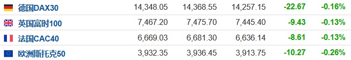 2. 截至发稿,德国DAX指数跌0.16%,英国富时100指数跌0.13%,法国CAC40指数跌0.13%,欧洲斯托克50指数跌0.26%。