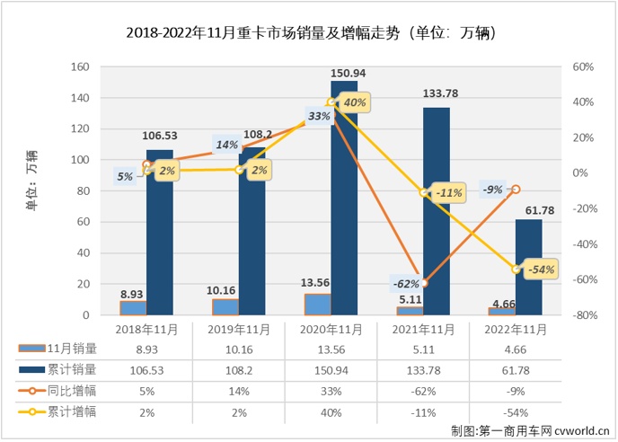 在上一轮重卡市场增长期(2017年-2020年),11月份重卡市场平均销量达到10.28万辆(比同期“银十”平均销量还高2000辆左右),而在这一轮从2021年5月份开始的下降期(或者说调整期)里,去年11月份重卡市场直接跌出天际创造年内最低月销量。纵观近五年11月份重卡销量及增幅走势图可见,2018年11月份重卡市场销量有接近9万辆的表现,2019年和2020年11月份重卡市场销量均超过10万辆,2020年11月份站上13.56万辆高位;再看2021年11月份,同比大降超6成回落至5万辆级别,而今年11月份销量更是还不足5万辆。实际上,去年11月份重卡市场5.11万辆的销量较去年上半年月均17.4万辆的水平已大幅下滑,还不足上半年月平均销量的1/3,但显然今年的市场更冷,今年11月份重卡市场在同期销量已经处于绝对低位的情况下仍然出现下滑,让人非常无奈。单从数字上看,11月份重卡市场4.66万辆的销量不仅是近五年11月份的最低销量,与刚过去的“铜九铁十”相比,还要低一些。
