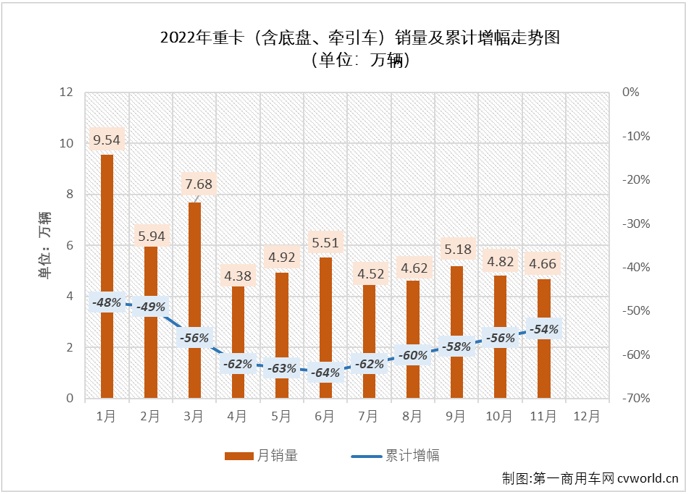 刚过去的10月份和11月份,重卡市场连续两个月销量低于5万辆的表现并没有让人觉得有多意外。实际上,2022年以来持续的需求不振让人对今年任何一个月的期望值都不高,但10月份4.82万辆、11月份4.66万辆的表现显然比这不高的期望值还要低。11月份,重卡市场没有“战胜”去年5.11万辆的同期水平,去年12月份,重卡市场销量也不算高,仅5.75万辆,但按照如今这个趋势,重卡市场的下一次增长,大概率要等到2023年了。