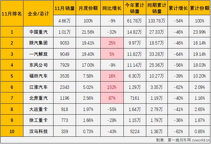 从累计销量看,今年1-11月我国重卡市场累计销售61.78万辆,同比下降54%,累计降幅较1-10月(-56%)缩窄2个百分点,约相当于去年同期累计销量的46%。具体到销量前十企业来看,十家企业均处于下降区间,且累计降幅均达到两位数。重汽、陕汽、福田、北奔、大运、徐工等企业降幅低于行业整体的54%,跑赢市场“大盘”。