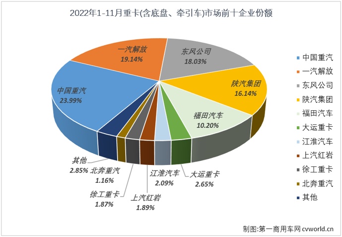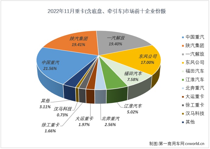 11月份,重汽蝉联重卡市场月销量榜冠军。2022年1-11月,解放、东风、重汽和陕汽四家企业均尝到过重卡市场月榜冠军的滋味,市场整体虽持续低迷,但榜首之争却颇有看点。第一商用车网还注意到,11月份重卡市场整体来看环比下降3%,具体到销量前十企业来看涨跌各半,5家企业11月份销量较10月份有所下滑,另5家企业则实现增长,陕汽、东风、江淮(600418.SH)、北奔和大运11月份销量环比分别增长了15%、2%、149%、127%和11%。