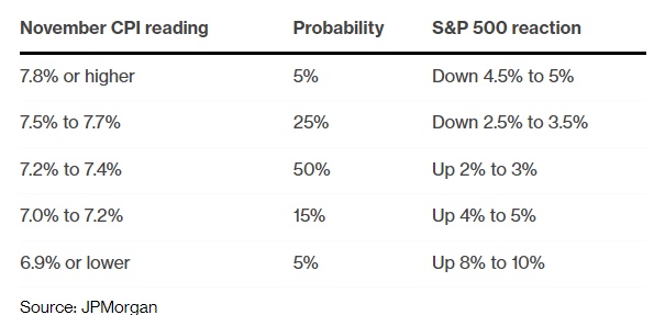摩根大通团队认为发生这种情况的概率为5%,虽然可能性相当小,但该分析反映了一种普遍观点,即11月的CPI在决定市场的近期走势方面起着关键的作用。市场预计CPI公布数据将为7.3%,在美联储今年最后一次政策会议前一天发布。而前值所公布的降温数据令标准普尔500指数日均上涨5.5%。