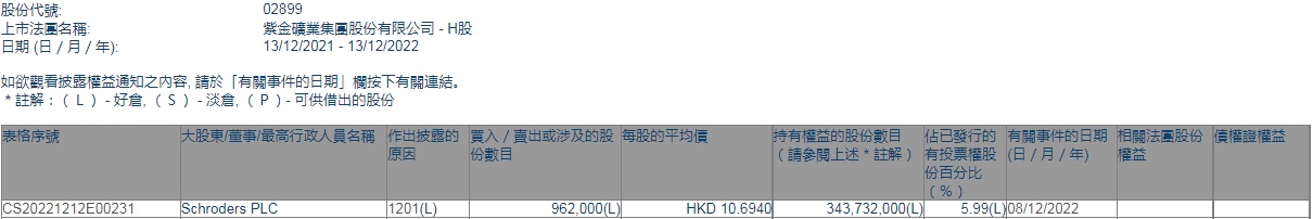 智通财经APP获悉,港交所最新资料显示,12月8日,Schroders PLC减持紫金矿业(02899)96.2万股,每股作价10.6940港元,总金额约为1028.76万港元。减持后最新持股数目约为3.44亿股,最新持股比例为5.99%。