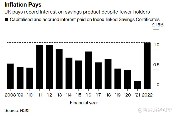 智通财经APP获悉,十多年前终止的一项政府支持债券计划正在保护一小群英国储户免受当今生活成本紧缩的影响。数据显示,在截至4月的财政年度,英国指数挂钩储蓄凭证(ILSC)的利息支出达到创纪录的12亿英镑(15亿美元)。ILSC是免税的,且其利率跑赢了通胀。