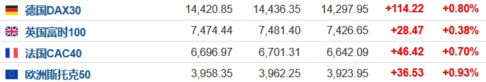 2. 截至发稿,德国DAX指数涨0.80%,英国富时100指数涨0.38%,法国CAC40指数涨0.70%,欧洲斯托克50指数涨0.93%。