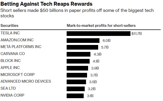 卖空者今年通过做空科技巨头公司获得了近500亿美元的收益,一些看空者预计2023年将进一步盈利。空头投资者表示,即使在纳斯达克100指数今年暴跌28%之后,许多股票的股价相对于预期销售额或收益仍然昂贵,这表明多年牛市中的一些泡沫仍有待破灭。