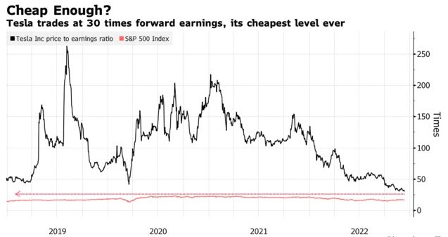 今年的抛售使特斯拉的估值降至上市13年来的最低水平。特斯拉的股价今年下跌了52%,市盈率为30倍。然而,怀疑人士称,鉴于这家电动汽车制造商正在努力应对于中国市场销售放缓的问题,而且该公司首席执行官埃隆·马斯克正在推特(TWTR.US)上花费大量时间,该公司的估值可能还不够低。