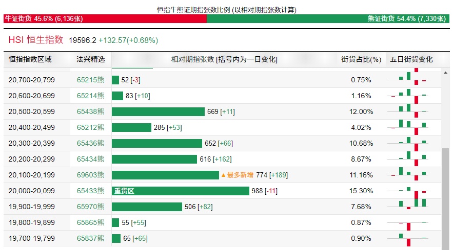 法兴恒指牛熊证街货分布图中的数据显示,熊证街货重货区在20000-20099区间,该区间最新熊证数量为988张,较上一交易日减少11张;最多新增在20910-20199区间,该区间最新熊证数量为774张,较上一交易日增加189张。