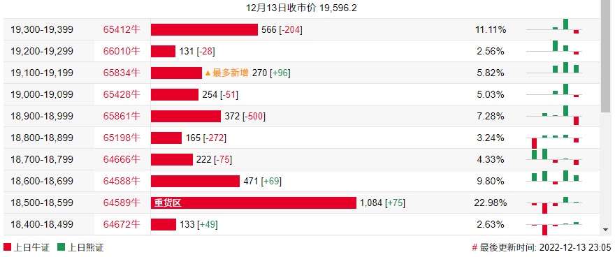 牛证街货重货区在18500-18599区间,该区间最新牛证数量为1084张,较上一交易日增加75张;最多新增在19100-19199区间,该区间最新牛证数量为270张,较上一交易日增加96张。