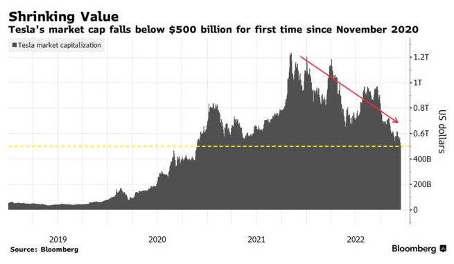 随着特斯拉股价重挫,回吐了过去两年累积的所有涨幅,该公司逐渐失去了冲进万亿美元估值俱乐部的成员资格,并将其作为标普500指数中第五大最具价值公司的地位让给了伯克希尔哈撒韦(BRK.US)。