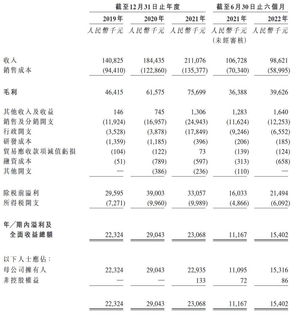 财务方面,于2019年度、2020年度及2021年度,该公司收入分别为人民币(下同)约1.408亿元、约1.844亿元、约2.111亿元。同期,毛利分别为人民币约4641.5万元、6157.5万元、7569.9万元。