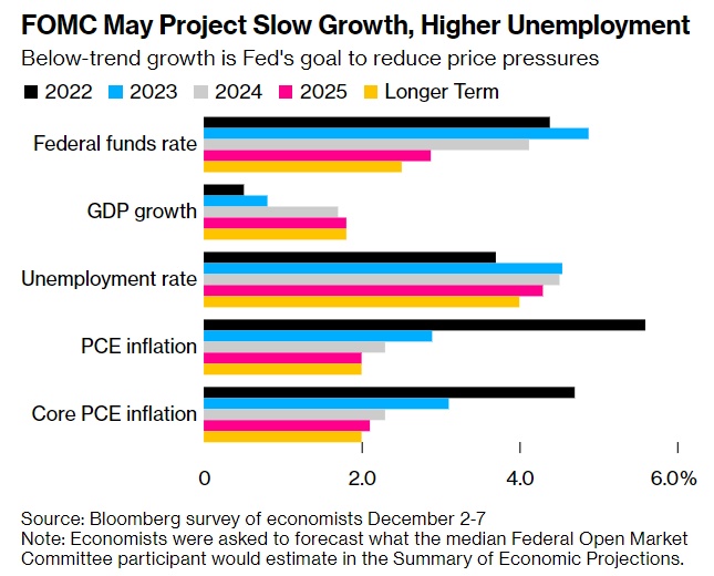 根据对多位经济学家进行的调查显示,在鲍威尔表示他们需要将利率提高至高于此前预期的水平之后,预估中值达到4.9%。这意味着FOMC将在明年2月和3月将加息幅度下调至25个基点,然后暂停紧缩政策。从当前利率期货市场的定价来看,投资者的看法也是一致的。