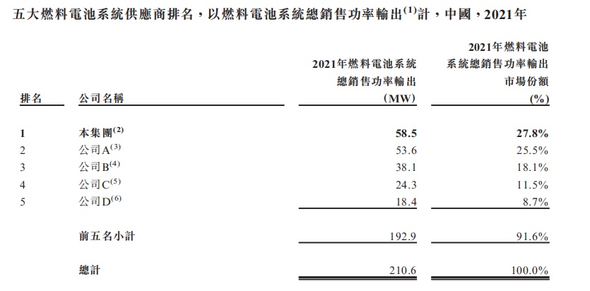 据灼识咨询报告,按2021年燃料电池系统总销售功率计,亿华通在中国燃料电池系统市场排名第一,市场份额为 27.8%。另外,截至截至2022年6月30日,该公司的燃料电池系统已安装于工信部新能源汽车目录中的80款燃料电池汽车上,位居行业第一。