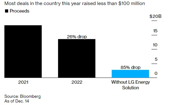 数据显示,今年韩国新股发行的筹资额较2021年下降了26%。虽然与中国香港等其他主要市场的大幅下降相比这是一个温和的回落,但如果排除LG新能源的IPO,韩国的跌幅将扩大至85%。