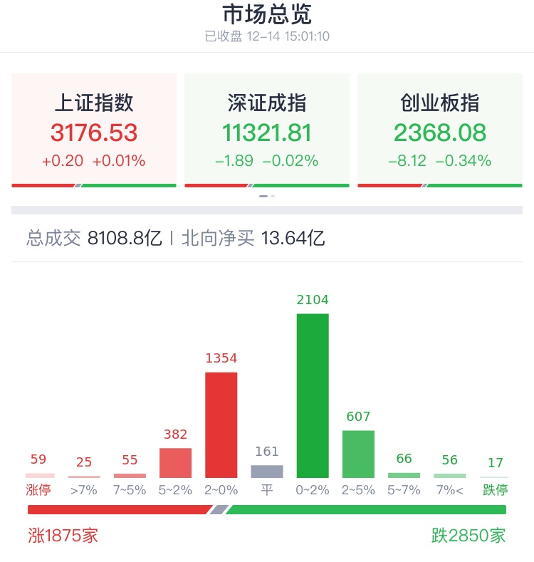 12月14日,A股窄幅震荡,创指跌幅较大。截至收盘,沪指涨0.01%,报3176.53点;深成指跌0.02%,报11321.81点;创业板指下跌0.34%,报2368.08点。