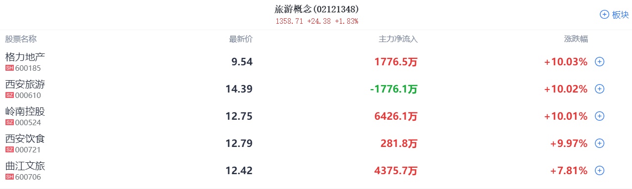 酒店餐饮、景点旅游板块震荡拉升,同庆楼涨停创历史新高,西安饮食三连板,西安旅游涨停,岭南控股午后涨停,曲江文旅、中青旅、众信旅游、三特索道、西藏旅游、西域旅游等跟涨。