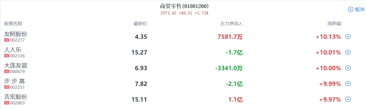 零售股震荡走强,人人乐7连板,大连友谊、友阿股份涨停,步步高、新华百货、中兴商业、三江购物等跟涨。