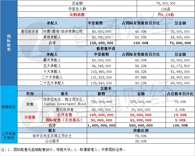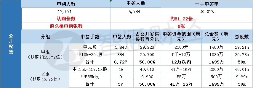 其中,公开配售申购人数17571人,一手中签率20.01%,认购倍数约51.22倍。