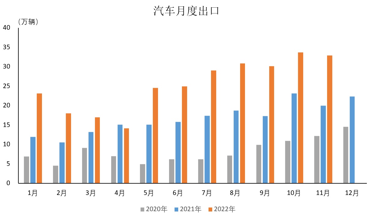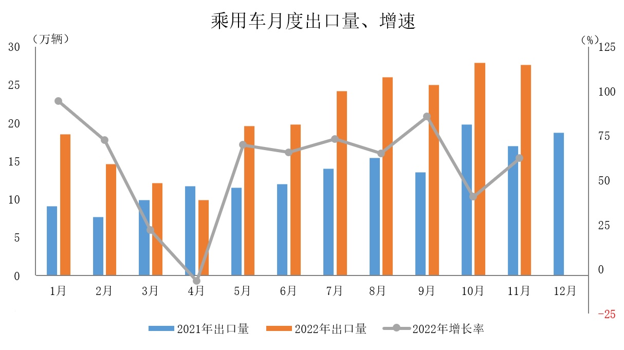 2022年11月,乘用车出口27.6万辆,环比下降1%,同比增长62.2%。2022年1-11月,乘用车出口225.1万辆,同比增长57.8%。