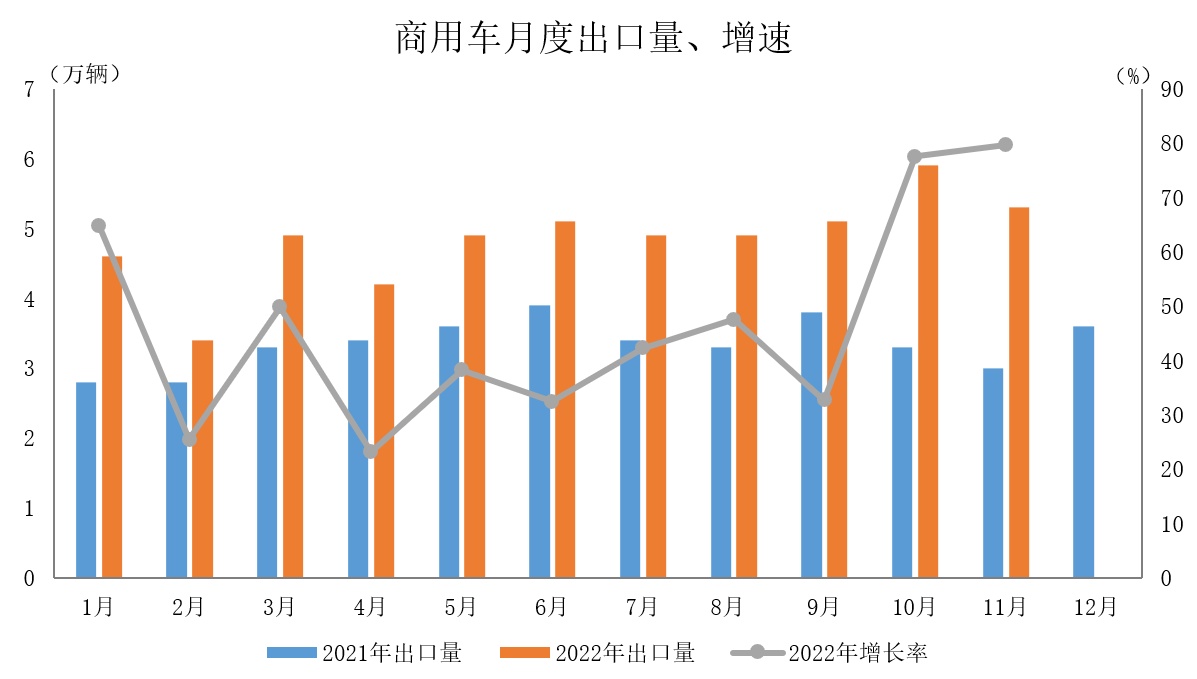 2022年11月,商用车出口5.3万辆,环比下降9.5%,同比增长79.7%。2022年1-11月,商用车出口53.3万辆,同比增长45.7%。