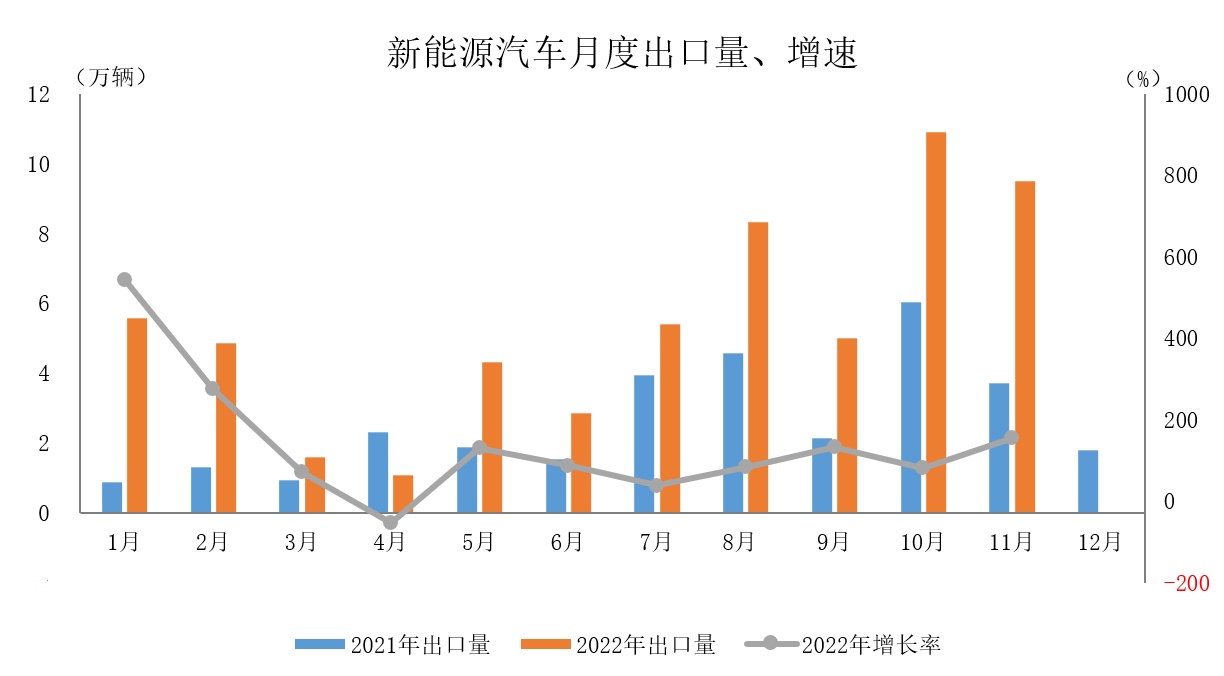 2022年11月,新能源汽车出口9.5万辆,环比下降13.2%,同比增长1.5倍。2022年1-11月,新能源汽车出口59.3万辆,同比增长1倍。