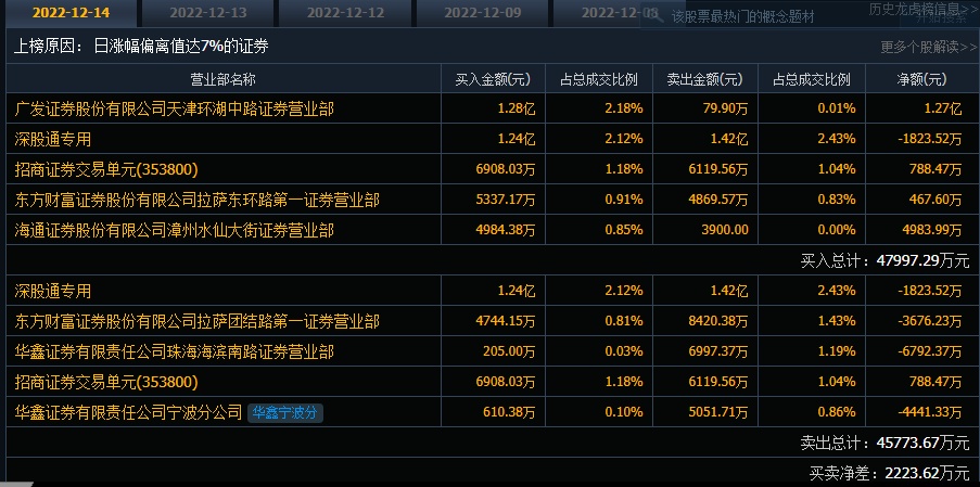 沪深交易所2022年12月14日公布的交易公开信息显示,新华制药因日涨幅偏离值达7%而登上龙虎榜,数据显示,上榜营业部席位全天成交9.38亿元,占当日总成交金额比例为15.98%。其中,买入金额为4.8亿元,卖出金额为4.58亿元,合计净买入2223.62万元。具体来看,广发证券天津环湖中路证券营业部、深股通专用分别买入1.28亿元、1.24亿元;深股通专用、东方财富证券拉萨团结路第一证券营业部分别卖出1.42亿元、8420.38万元。