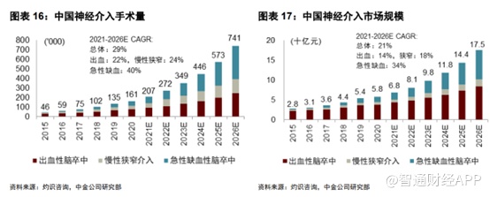 神经介入是疏通与修复脑血管通路的微创手术,通过取栓、扩张、栓塞等方式进行血管内治疗。根据灼识咨询数据及中金公司的测算,2020年,中国出血性脑卒中介入手术量为7.5万台,目标患者渗透率不足10%;急性缺血性脑卒中和动脉粥样硬化血管狭窄(CAS)的介入手术量分别为4.8和3.9万台,目标患者渗透率分别仅有2.7%和1.0%;相较美国等发达国家提升空间较大。根据灼识咨询测算,中国的神经介入器械市场规模将从2021年的68亿元增长至2026年的175亿元,CAGR为21%。