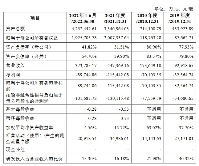 财务方面,于2019年度、2020年度、2021年度及2022年上半年,公司实现营业收入约为9.29亿元、17.36亿元、44.74亿元以及37.38亿元。归属于母公司所有者的净利润分别约为-3.26亿元、-7.01亿元、-11.54亿元以及-8.97亿元。