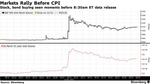 智通财经APP获悉,周二美国11月CPI数据公布前一分钟内,美股和美债跳涨。据传,美国11月CPI数据被泄露,导致数据公布前金融市场出现大量押注。标普500指数期货在CPI数据公布前飙升超过1%;美债买盘暴增,3月到期的10年期国债期货成交量达到13518,导致基准十年期美债收益率被推低约4个基点。在如此短的时间内出现如此大的波动、甚至比某些交易日的全天波动还要大,这引起了市场的怀疑。