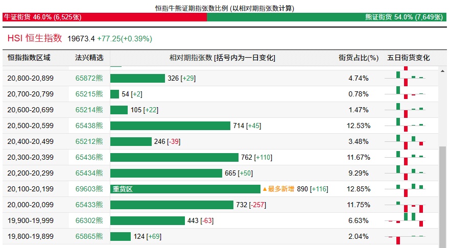 法兴恒指牛熊证街货分布图中的数据显示,熊证街货重货区在20100-20199区间,该区间最新熊证数量为890张,较上一交易日增加116张;最多新增在同一区间。