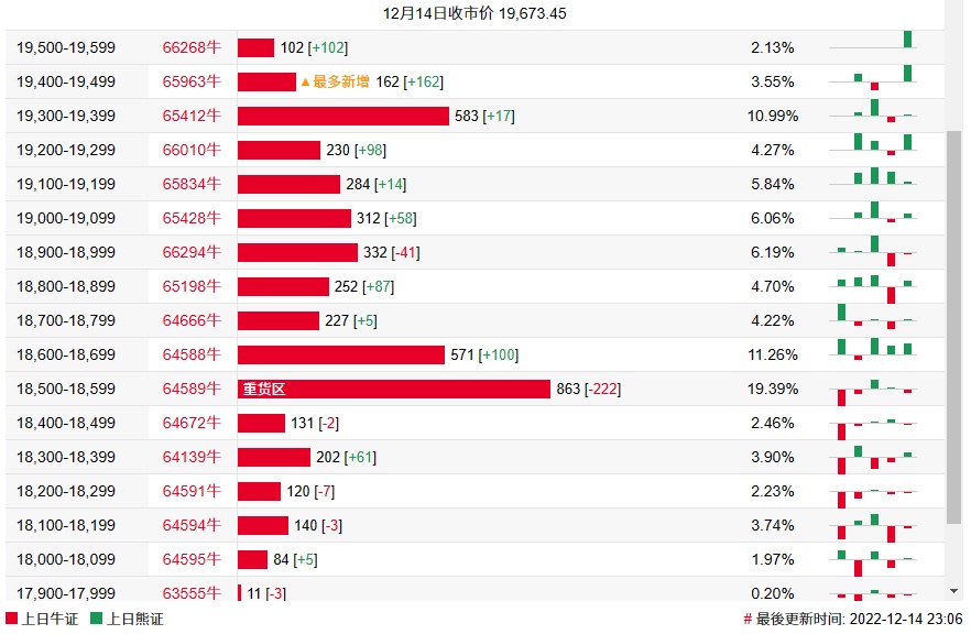 牛证街货重货区在18500-18599区间,该区间最新牛证数量为863张,较上一交易日减少222张;最多新增在19400-19499区间,该区间最新牛证数量为162张,较上一交易日增加162张。