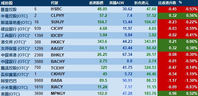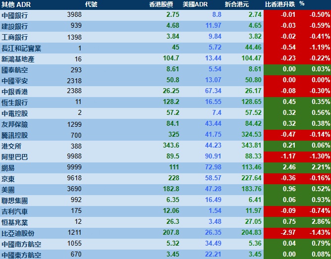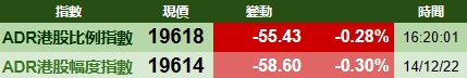 智通财经APP获悉,周三美股三大指数集体收跌,港股ADR指数下跌,按比例计算,收报19618点,较香港收市跌55.43点或0.28%。