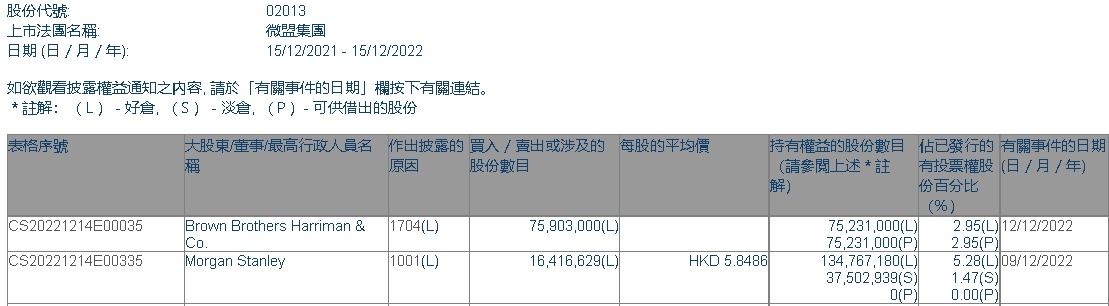 智通财经APP获悉,香港联交所最新资料显示,12月9日,大摩增持微盟集团(02013)1641.6629万股,每股作价5.8486港元,总金额约为9601.43万港元。增持后最新持股数目约为1.35亿股,最新持股比例为5.28%。