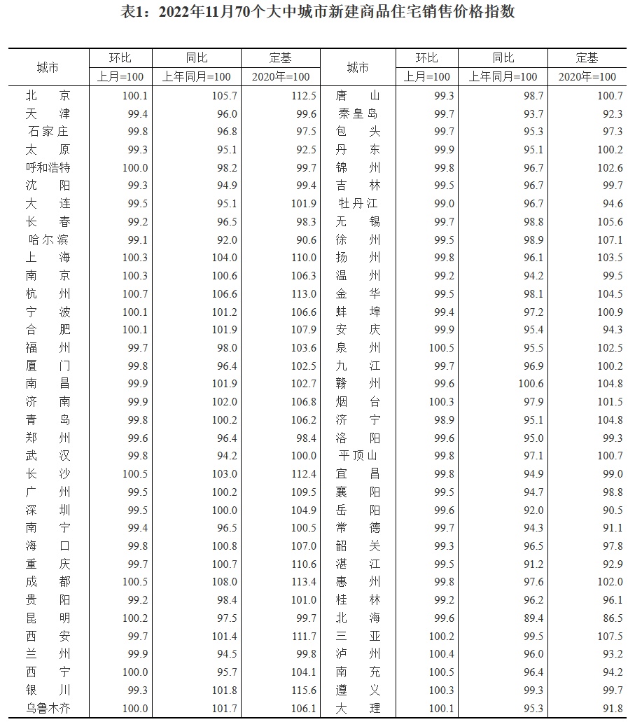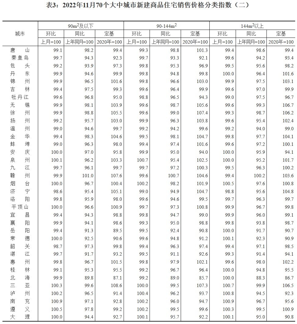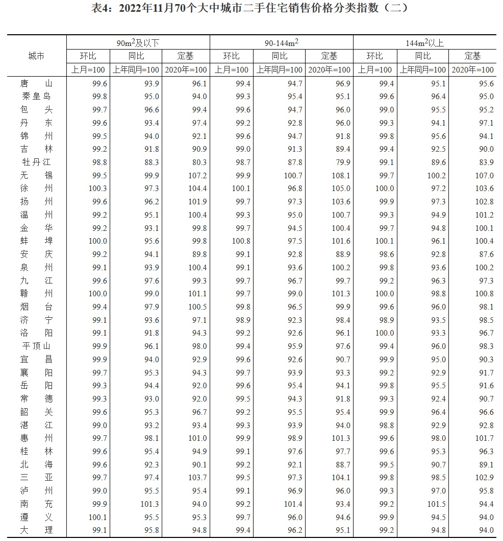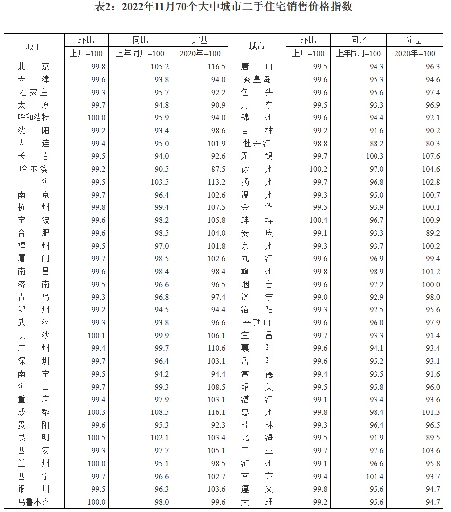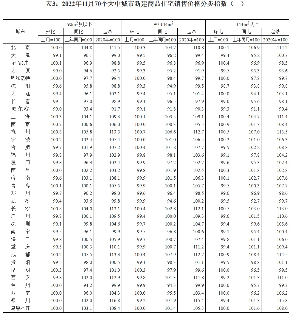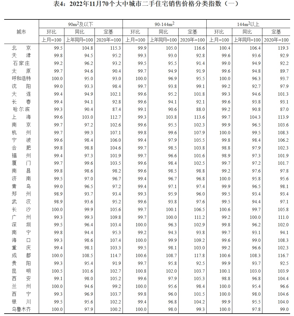 智通财经APP获悉,12月15日,国家统计局发布2022年11月份70个大中城市商品住宅销售价格变动情况。数据显示,11月份,各线城市商品住宅销售价格环比下降,一线城市同比涨幅回落、二三线城市同比降势趋缓。11月份,70个大中城市中,新建商品住宅销售价格环比下降城市有51个,比上月减少7个;二手住宅销售价格环比下降城市有62个,个数与上月相同。11月份,一线城市新建商品住宅和二手住宅销售价格环比分别下降0.2%和0.4%,降幅比上月均扩大0.1个百分点。二线城市新建商品住宅和二手住宅销售价格环比分别下降0.2%和0.4%,降幅比上月均收窄0.1个百分点。三线城市新建商品住宅销售价格环比下降0.3%,降幅比上月收窄0.1个百分点;二手住宅销售价格环比下降0.5%,降幅与上月相同。