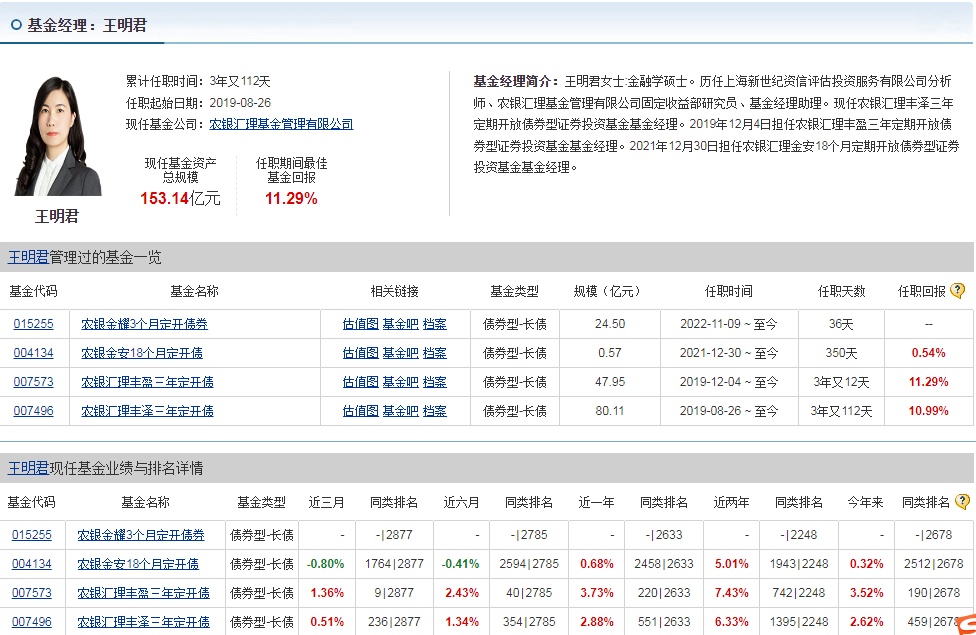 据悉,王明君目前在管理的基金包括农银金耀定开债券(015255)、农银金安定开债券(004134)、农银丰盈定开债券(007573)、农银丰泽定开债券(007496)等,后三个基金近三月收益率分别为-0.80%、1.36%、0.51%。