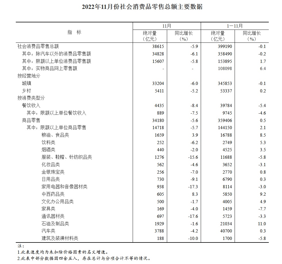 按消费类型分,11月份,商品零售34180亿元,同比下降5.6%;餐饮收入4435亿元,下降8.4%。1—11月份,商品零售359406亿元,同比增长0.5%;餐饮收入39784亿元,下降5.4%。