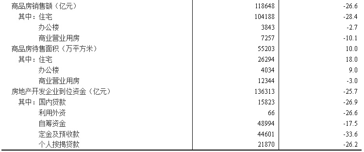 1—11月份,商品房销售面积121250万平方米,同比下降23.3%,其中住宅销售面积下降26.2%。商品房销售额118648亿元,下降26.6%,其中住宅销售额下降28.4%。