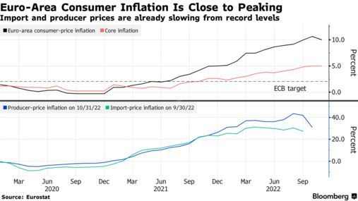 在欧洲央行实行历史上最激进的一轮货币紧缩政策之后,更温和的加息可能预示着利率峰值即将到来。上个月,欧元区的通胀在近一年半内首次放缓,不过仍为两位数。