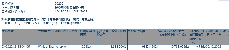 智通财经APP获悉,香港联交所最新资料显示,12月9日,Winkler Evan Andrew减持新濠国际发展(00200)168.3万股,每股作价8.9421港元,总金额约为1504.96万港元。减持后最新持股数目约为1076.90万股,最新持股比例为0.71%。