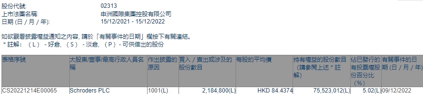智通财经APP获悉,香港联交所最新资料显示,12月9日,Schroders PLC增持申洲国际(02313)218.48万股,每股作价84.4374港元,总金额约为1.84亿港元。增持后最新持股数目约为7552.30万股,最新持股比例为5.02%。