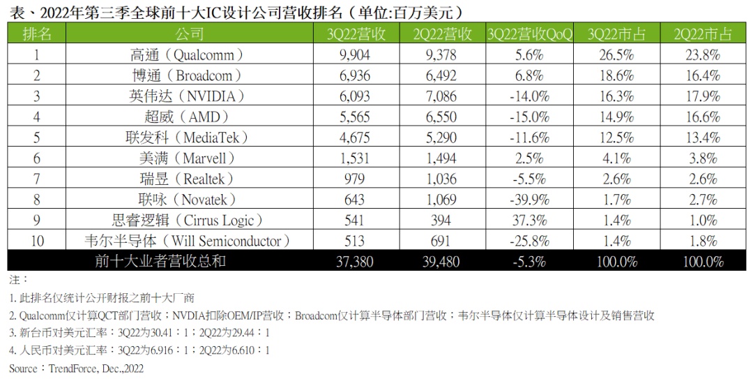 智通财经APP获悉,12月15日,全球市场研究机构TrendForce集邦咨询旗下半导体研究处表示,第三季度在乌俄冲突、疫情、通胀压力与客户库存调节等负面因素影响下,全球IC设计产业营收动能下滑,2022年第三季全球前十大IC设计业者营收达373.8亿美元,环比减少5.3%。Qualcomm(高通)(QCOM.US)仍居产业龙头之位,而Broadcom(博通)(AVGO.US)由于高端网通芯片销售情况良好,超车NVIDIA(英伟达)(NVDA.US)与AMD(超威)(AMD.US)至排名第二,NVIDIA与AMD在个人计算机与挖矿需求疲弱的情况下,排名分别下滑至第三与第四。