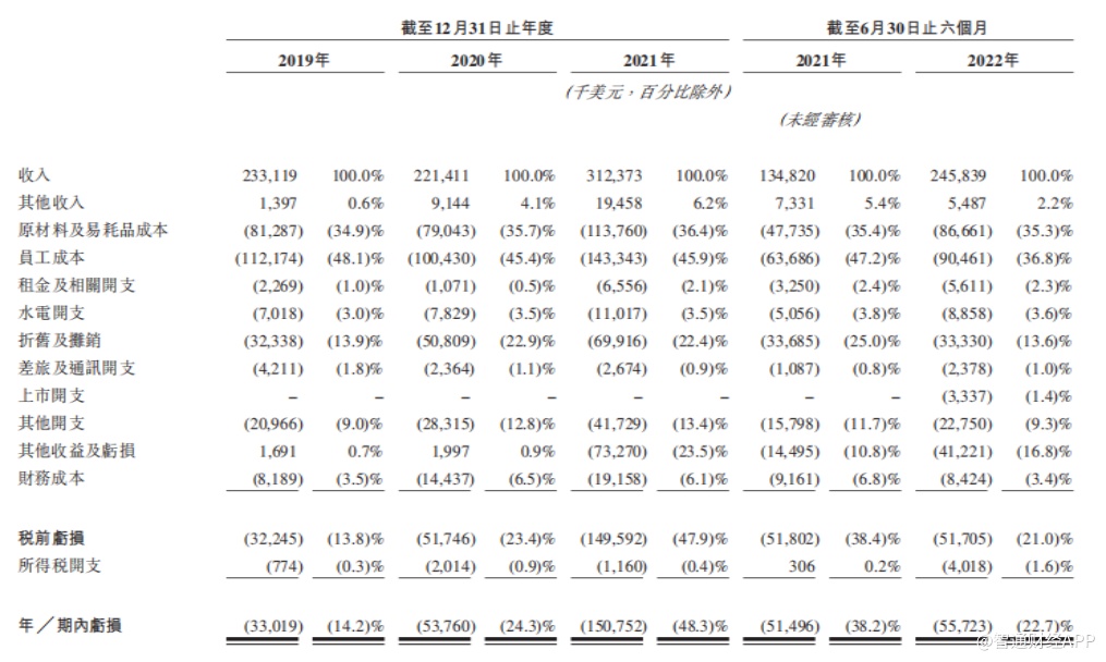 从财务数据上看,特海国际过往亏损的主要原因是原材料及易耗品成本、员工成本占收入比重较高。以2021年为例,公司原材料及易耗品成达到1.14亿美元,占收入比重高达36.4%,同期员工成本达到1.43亿美元,占收入比重高达45.9%,二者总计占收入比重高达82.3%。