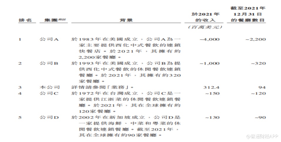 按2021年的收入计,特海国际是国际市场(中国大陆及港澳台地区以外的全球市场)第三大中式餐饮品牌。根据弗若斯特沙利文报告,按2021年的收入计,特海国际为国际市场上源自中国的最大中式餐饮品牌,按截至2021年12月31日自营餐厅覆盖的国家数目计,公司同样是国际市场上最大的中式餐饮品牌。