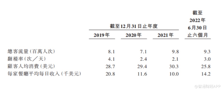 除此之外,翻台率的下滑也放大了特海国际的成本压力。2019年至2021年,公司餐厅翻台率从4.1次/天下滑至2.1次/天,每家餐厅平均每日收入从2.08万美元下滑至1万美元。2022年上半年,翻台率回升至3.0次/天,但顾客人均消费金额下滑只25.8美元,低于2019年以来的平均水平。