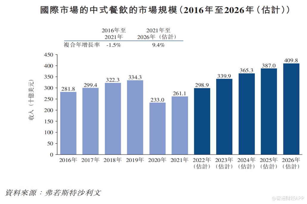 弗若斯特沙利文报告显示,国际市场的中式餐饮市场占国际市场的百分比稳步增长,从2016年的9.7%上升至2021年的9.9%,预计到2026年将继续增长至10.8%。主要由于中国文化日益受欢迎,国际市场对中式餐饮的接受度不断提高,加上中式餐饮适应当地顾客不断创新。国际市场的中式餐饮的增长速度将超过国际餐饮服务市场的增长速度,从2021年的2,611亿美元增长到2026年的4,098亿美元,复合年增长率为9.4%。